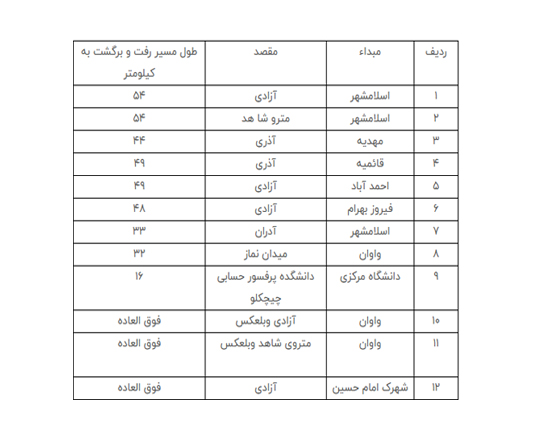 خط ۴ : میدان آزادی، سعیدی جنوب ،کمربندی الغدیر اسلامشهر، جنب مسکن مهر